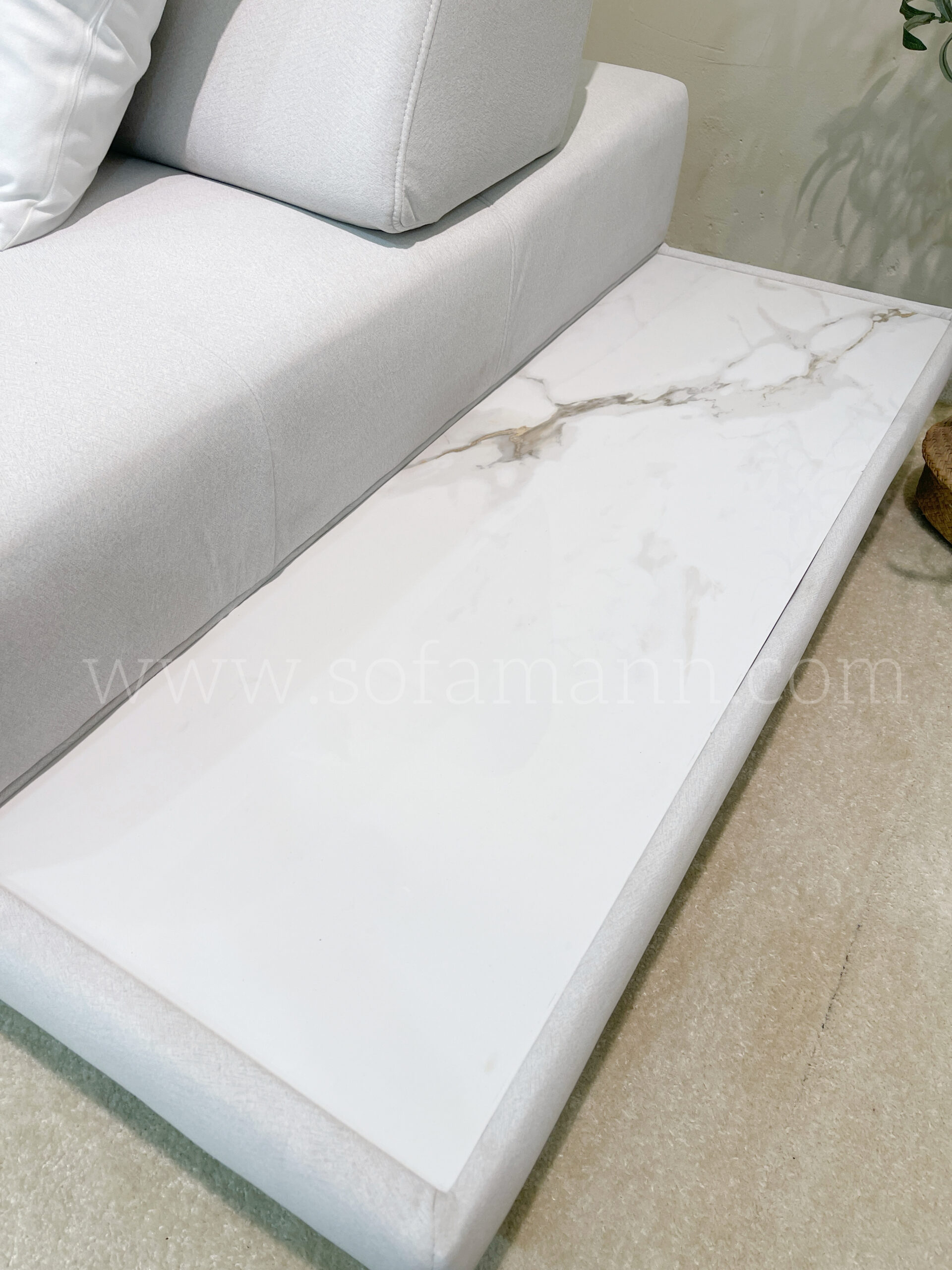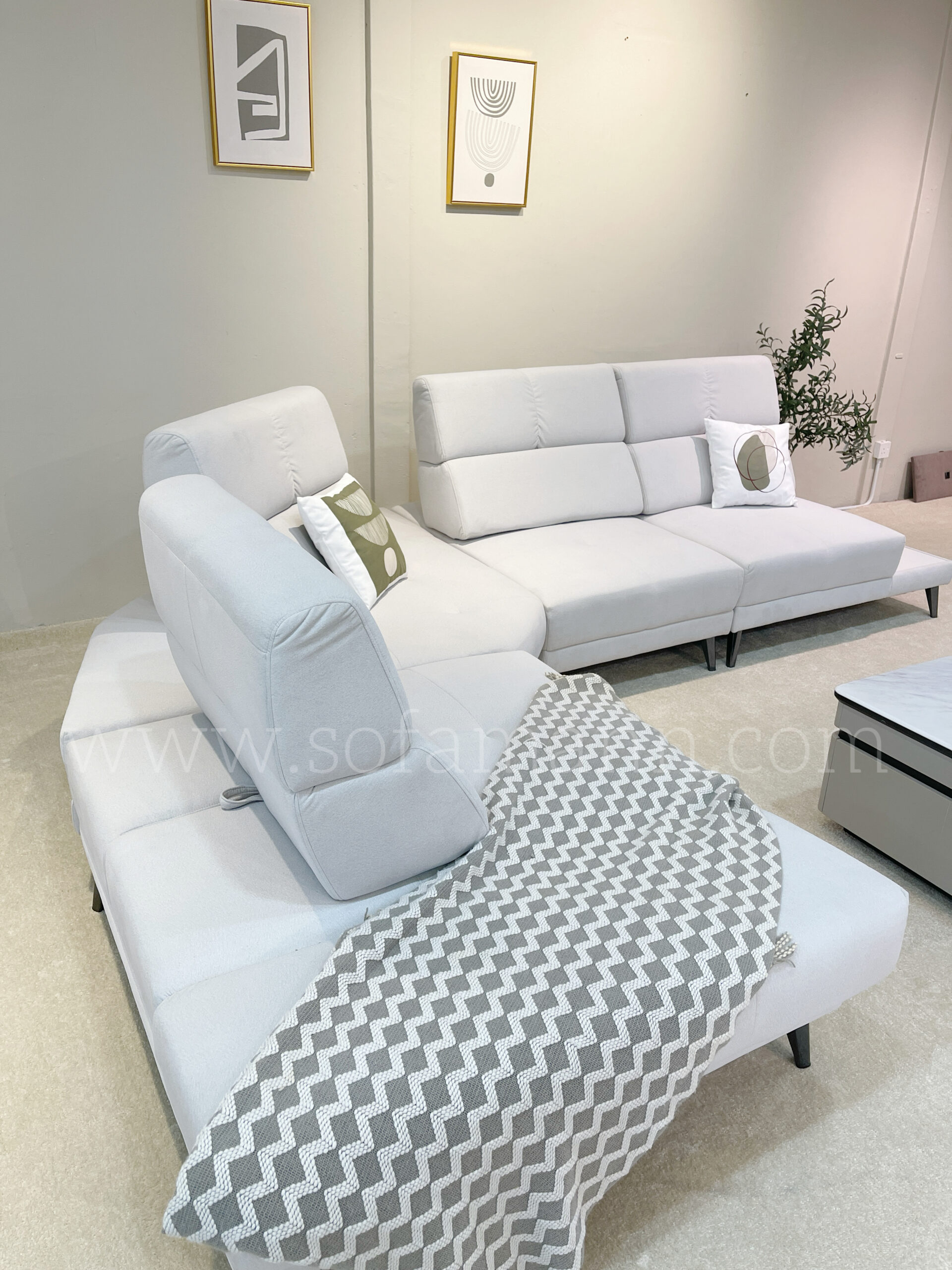 .This customizable sofa is thoughtfully crafted for both comfort and elegance, featuring a high-quality cushion system made from natural latex, high-density foam, pocket springs, and ZZ springs for superior support and lasting durability. Upholstered in easy-clean fabric, it’s designed for hassle-free maintenance. The sturdy frame has been upgraded from meranti wood to durable kayu kapur for enhanced strength. Additional features include a push-back function, comfortable armrests, and a stylish side table with a marble design integrated into the side of the sofa — making it a perfect blend of functionality and modern design.